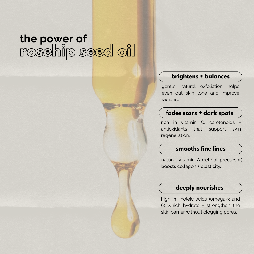Rosehip Seed Oil → Brightens, fades dark spots, promotes regeneration