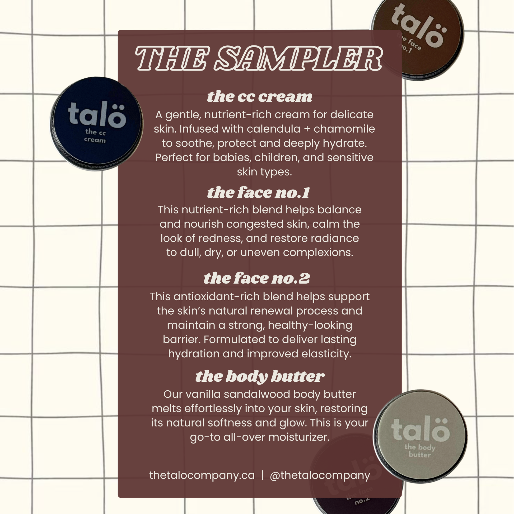 If you don't know where to start, this is a good place! Try our 4 best sellers, the CC Cream, The Face No.1, The Face No.2 and The Body Butter (Vanilla Sandalwood) all wrapped up in a cotton bag with a info card about each product.
